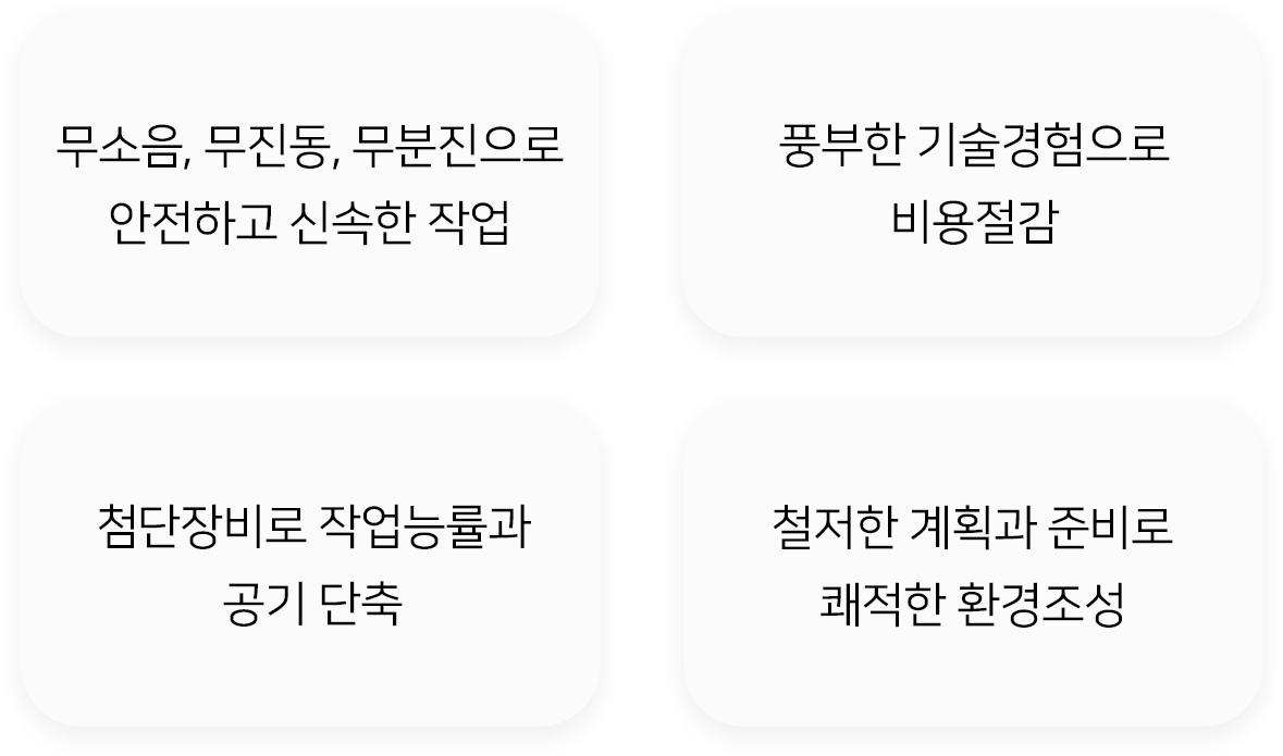 가장 안전하고 신속하며 고객의 이윤 극대화를 창출하는 최첨단 시스템으로 철거를 준비합니다.